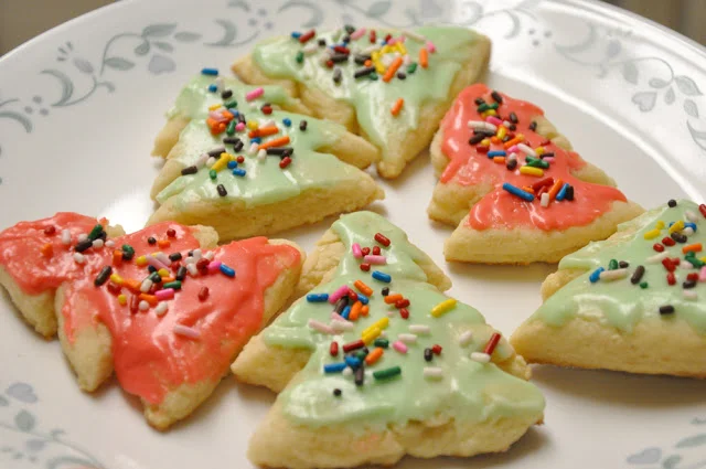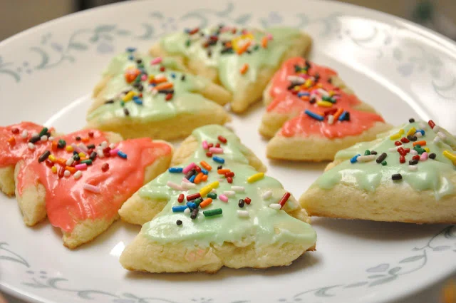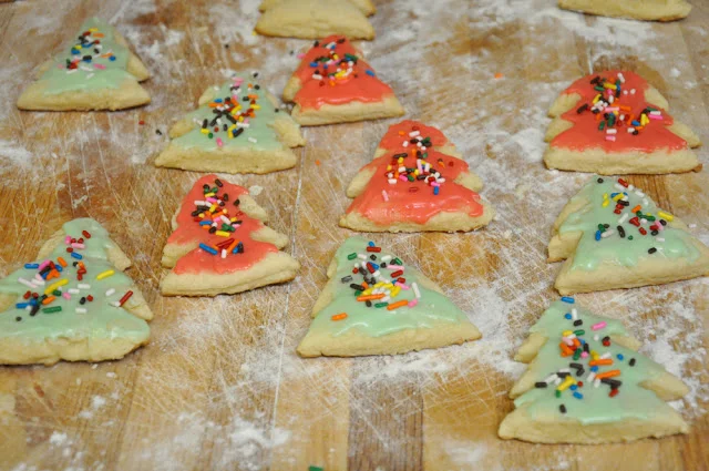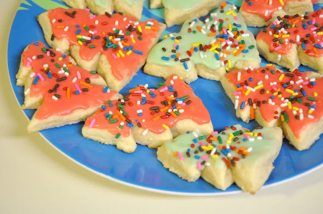 Let cool before you put frosting on them. Tanner and I got overzealous and iced them right away, and it melted all over everything. Both messy and delicious. Do yourself a favor and wait until they're completely cool. Add sprinkles to make the cookies look more like decorated Christmas trees!