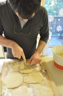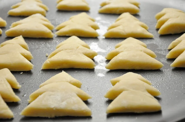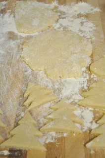 When the dough has chilled, roll it out on a floured surface (flour is important... even after chilling it will still be sticky) about 1/8" - 1/4" thick, depending on how big and soft you want your cookies. Use cookie cutters to make shapes, or, if you're like me and do not own cookie cutters, cut them by hand. Here's a tip: don't get fancy. Cutting out Christmas trees by hand was about the fanciest thing I could do without it looking like a big blob.