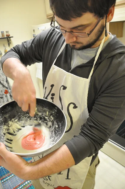Tanner and I divided the frosting into two bowls and added in red and green food coloring to make it more Christmassy. Unfortunately, instead of a nice forest green and burgundy, we ended up with mint and pink. Perhaps we should have made these for Easter, instead...